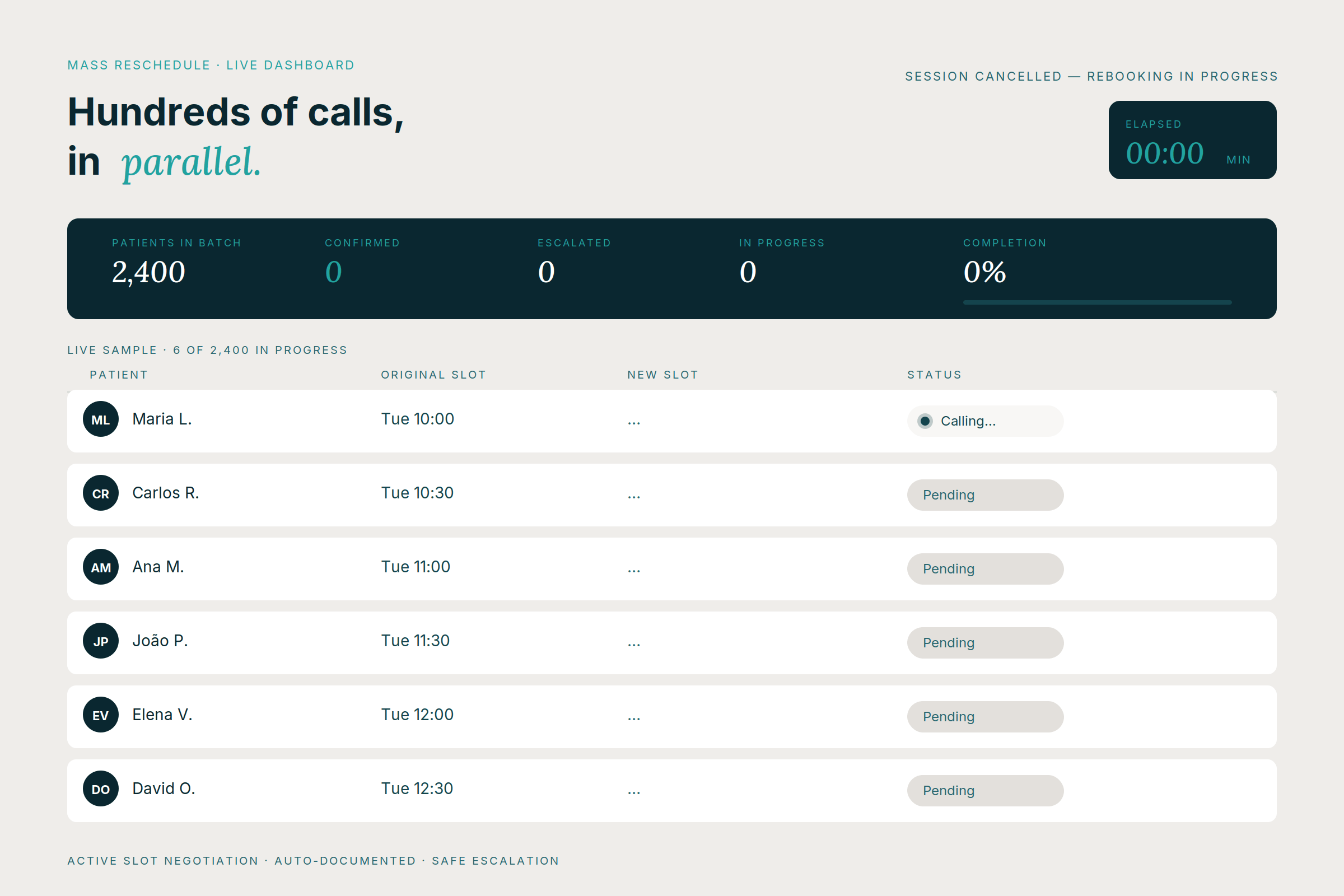 When a clinic session is cancelled or capacity shifts, the challenge isn't just reaching patients, it's reaching them, negotiating a new slot, confirming the change, and updating systems. Multiplied by hundreds of patients, in the shortest time possible.
